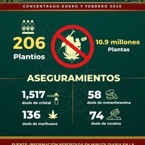 Señaló que, durante enero y febrero, se aseguraron armas, municiones, vehículos y artefactos que representaban un riesgo para la población; también se retiraron de circulación sustancias que afectan a las juventudes y se destruyeron plantíos ilícitos que dañan el tejido social. Enfatizó que detrás de cada cifra hay trabajo operativo, coordinación institucional y decisiones orientadas a cuidar la vida y preservar la paz.